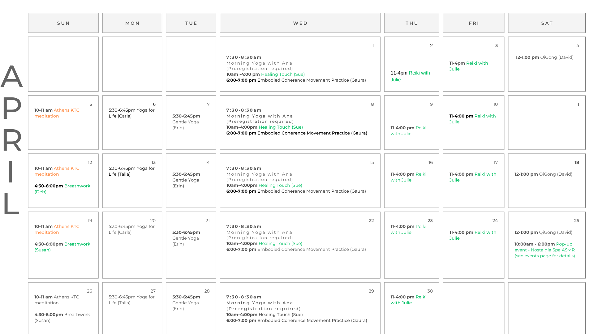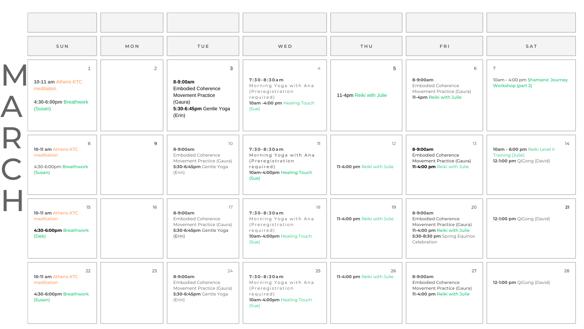 Studio Schedule Classes are drop in unless noted as a multi week series. Payment is cash or venmo to the instructor at time of class. For events and workshops pre-registration may be required. Check out the Events Pages for details.