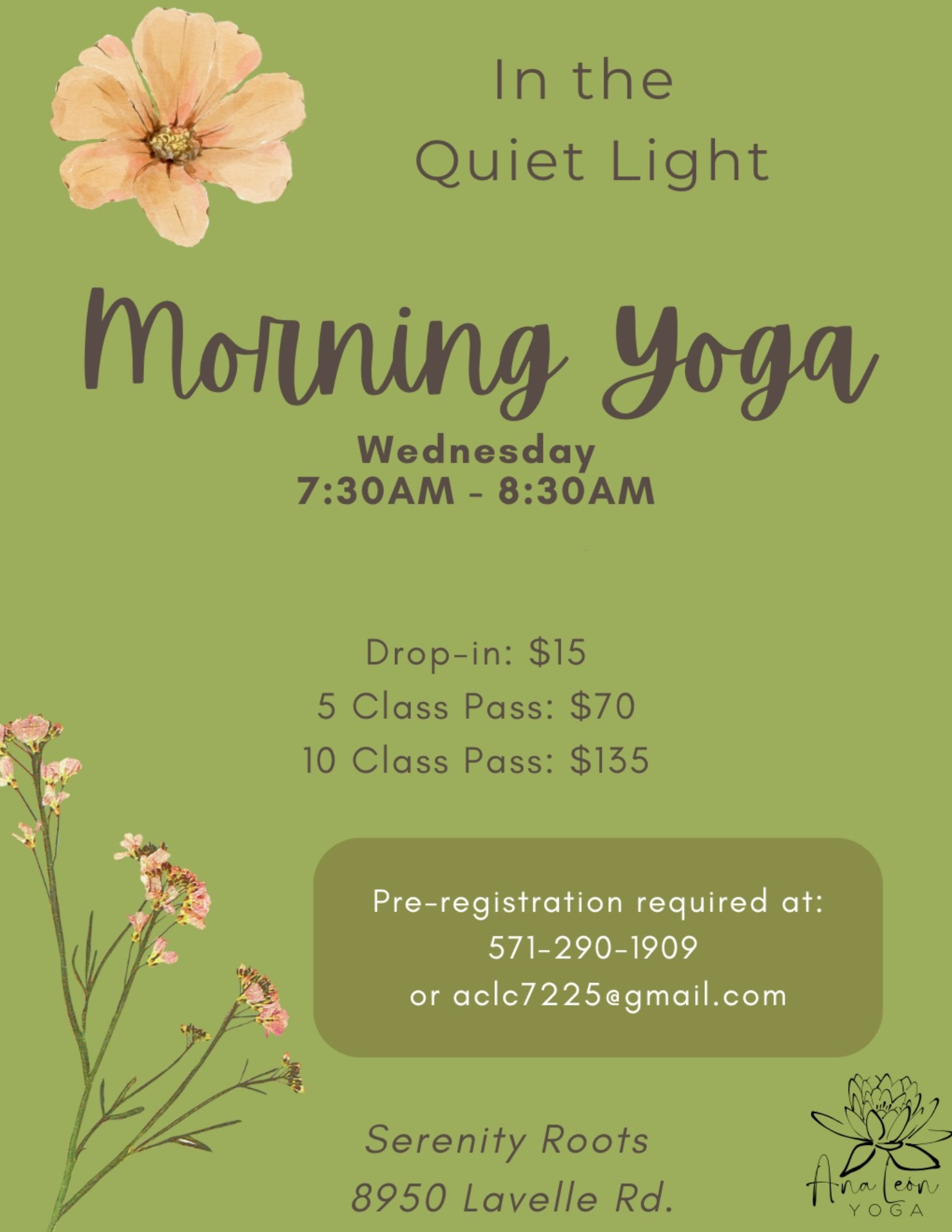 Join Ana every Wednesday at 7:30am for a gentle and grounding morning yoga practice.
